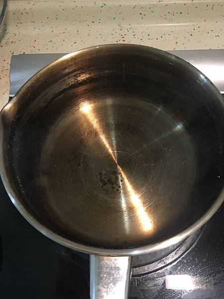 先用鍋子把水煮沸。可以看出鍋子內部髒髒的,之前用魔術泡綿都沒洗起來⋯⋯水熱了就關火,加一匙過碳酸鈉。